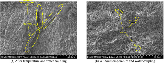 As can be seen from Figure 13, cracks in ring sandstone specimens after temperature and water coupling are wider than those without temperature and water coupling and have a tendency to expand.