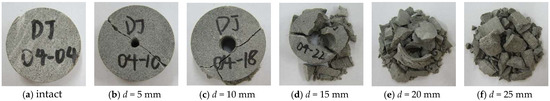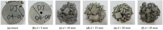 It can be seen from Figure 15 that the integrity of sandstone specimens decreases with the increase in the specimen’s inner diameter. The shape integrity of the ring sandstone specimen with warm water coupling is obviously less than that without warm water coupling. The fracture degree of the ring sandstone specimen increases with the increase in the specimen’s inner diameter.