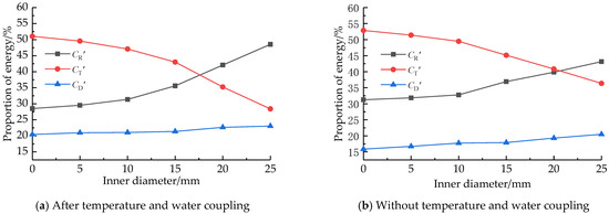 The proportion of absorbed energy of the ring sandstone specimen with temperature and water coupling is greater than that without temperature and water coupling. The absorption energy ratio of the ring sandstone specimen increases gradually with the increase in inner diameter.