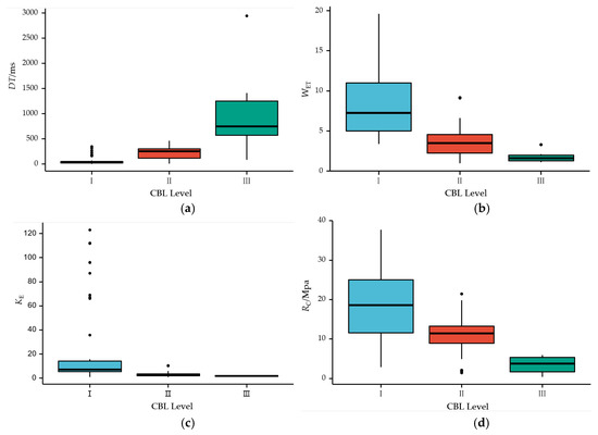 In accordance with the standard GB/T 25217.2-2010 and Reference [26], DT, WET, KE and RC are selected as the classification indexes of CBL, and the bursting-liability grade is divided into three categories of strong (I), weak (II), and none (III). DT is the time from ultimate strength to complete failure of coal samples under the uniaxial-compression-test conditions. WET is the ratio of elastic deformation energy to plastic deformation energy of coal specimens unloaded when the stress reaches a certain value under uniaxial compression. KE is the ratio of deformation energy accumulated before the maximum peak to that dissipated after the maximum peak, in the complete stress–strain curve of a specimen under uniaxial compression. RC is the maximum load on unit area of the specimen under the condition of infinite-side and axial-pressure for failure. A total of 95 groups of CBL samples in Table 1 are chosen as the training samples and the test samples.