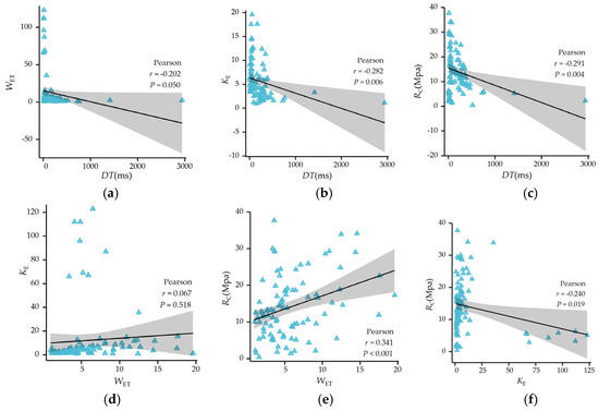 Correlation analysis of classification indexes: (a) DT and WET; (b) DT and KE; (c) DT and RC; (d) WET and KE; (e) WET and RC; (f) KE and RC.