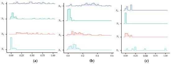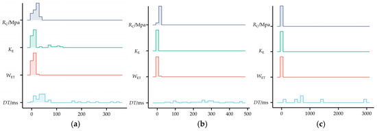 Table 1 shows that the dimensions and orders of magnitude of the four classification indexes are different. This can also be roughly seen from the boxplot in Figure 3. The value ranges of the vertical axes of the boxplot of different indexes are significantly different, and the difference is even more obvious under different levels of bursting liability. In order to clearly reflect the dimensional differences among indexes, the data of different indexes are plotted into ridge plots, as shown in Figure 5, so that the variation trend of each group of data and the data comparison between groups can be intuitively seen.