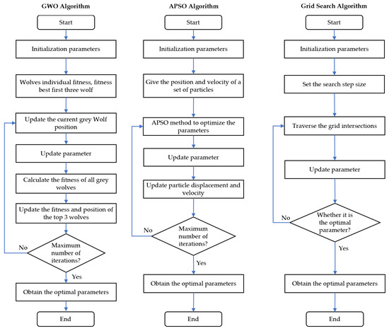 The penalty factor, c, and the kernel-function parameter, g, are essential parameters for SVM classification, and determine the classification effect of SVM. In this paper, three optimization methods were used to obtain these two parameters, among which the LSVM, QSVM, CSVM, FG-SVM, MG-SVM and CG-SVM models were optimized by a grid-search algorithm, the APSO-SVM model was optimized by the APSO algorithm, and the GWO-SVM model was optimized by the GWO algorithm. The optimization process of the three methods is shown in Figure 7.