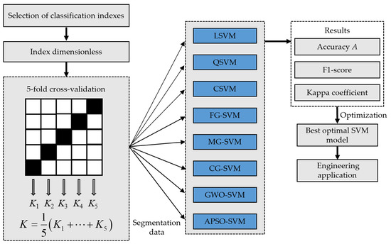 In this paper, an imbalanced sample set of CBL, containing 95 groups of measured data, is constructed. The sample set is divided into training set and test set, in accordance with the 5-fold cross-validation. Eight SVM models are used for classification research, and the best SVM model is selected for the engineering application. The research flowchart is shown in Figure 8.