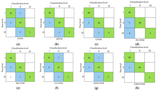 Classification results of eight SVM models: (a) LSVM; (b) QSVM; (c) CSVM; (d) FG-SVM; (e) MG-SVM; (f) CG-SVM; (g) APSO-SVM; (h) GWO-SVM.