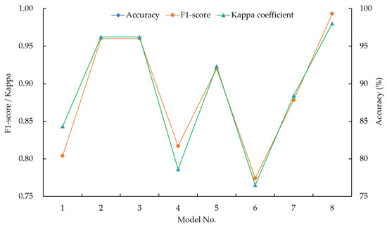 In this paper, eight SVM models are adopted to classify the CBL grade, and three indexes are used to evaluate the classification performance of the models. The results are shown in Table 4 and Figure 10.