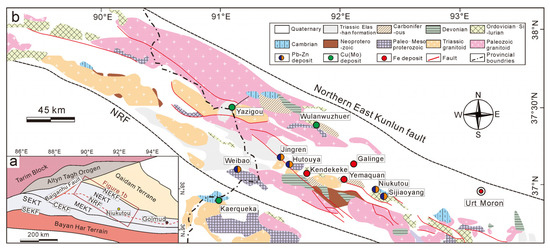 Tectonic framework of the eastern Kunlun area (a) and regional geological and mineral map of the Niukutou deposit (b) (modified from [2,12,13]). Abbreviations: NEKT—Northeast Kunlun terrane; NEKF—Northeast Kunlun fault; NRF—Nalingguole River fault; CEKF—Central-East Kunlun fault; MEKT—Middle-East Kunlun terrane; SEKT—Southeast Kunlun terrane; and SEKF—Southeast Kunlun fault.