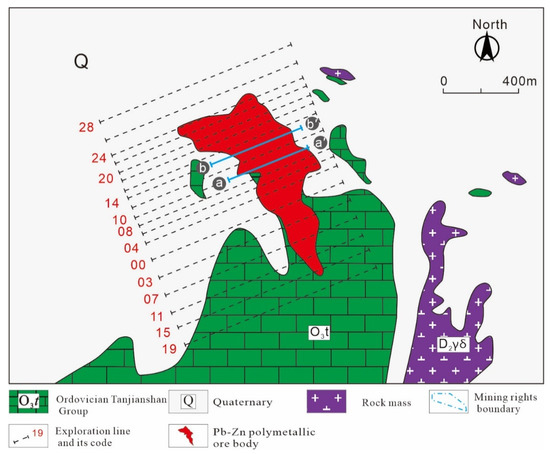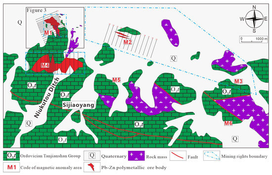 The Niukutou Pb-Zn skarn deposit is located in the eastern part of the QMB (Figure 1b) and comprises three ore blocks (or magnetic anomalies) referred to as M1, M4, and M2, from west to east. The Pb-Zn mineralization crops out within the M1 and M4 ore blocks (Figure 2), with the resources being more than 1.14 million tons.