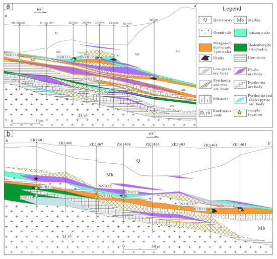 (3) The Niukutou deposit belongs to a manganese skarn pattern, and the skarn zonation and mineral geochemical characteristics show that the hydrothermal fluid migrated from the deep plutons to the shallow marble. The environments evolved from high fO2 and temperatures to low fO2 and temperatures and showed increasing pH and Mn contents, ultimately resulting in the close association between the Pb-Zn ore bodies and Mn-rich skarns.