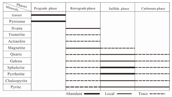 Based on the mineral assemblages, ore textures, and crosscutting relationships, the skarn formation and mineralization of the Niukutou deposit can be divided into four phases (Figure 5): (1) in the prograde metamorphic phase, the main mineral assemblages consist of anhydrous minerals such as garnet and pyroxene; (2) in the retrograde metamorphic phase, the main mineral assemblage is dominated by hydrous silicate minerals, characteristically ilvaite, actinolite, tremolite, epidote, and chlorite, which often replace prograde garnet/pyroxene; (3) the sulfide phase is the main ore-forming phase, where the mineral assemblage consists of ore minerals such as pyrrhotite, pyrite, sphalerite, galena, and quartz; and (4) in the carbonate phase, the mineral assemblage is characterized by quartz and calcite veins that cut through the skarn and ore minerals.