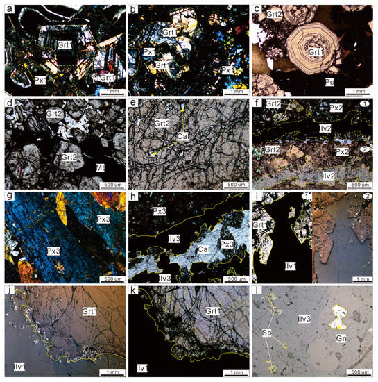 Photomicrographs of representative samples from different stages and their relationships in the Niukutou deposit. (a) Zoned garnet (Grt1) coexisting or replaced with hedenbergite (Px1) in cross-polarized light; (b) Zoned garnet (Grt1) coexisting or replaced with hedenbergite (Px1) in cross-polarized light; (c) Zoned garnet (Grt1) replaced with pyrrhotite, followed by the unzoned garnet (Grt2) in plane-polarized light; (d) Unzoned garnet (Grt2) replaced with magnetite (plane-polarized light); (e) Grt2 developed with cracks; (f) Grt2 and Px2 are replaced with Ilv2 (plane-polarized light in 1 and reflected light in 2); (g) Fibrous or long-column johannsenite (Px3) in cross-polarized light; (h) johannsenite (Px3) is replaced with ilvaite (Ilv3) and cut by a calcite vein (plane-polarized light); (i) Zoned garnet (Grt1) is replaced with the ilvaite (Ilv1, plane-polarized light in 1 and reflected light in 2); (j,k) Zoned garnet (Grt1) is replaced with Ilv1 (reflected light in j and plane-polarized light in k); (l) Disseminated galena and sphalerite developed within Ilv3 (reflected light). Abbreviations: Grt1, Px1, Ilv1—Garnet, pyroxene, and ilvaite of Stage 1; Grt2, Px2, Ilv2—Garnet, pyroxene, and ilvaite of Stage 2; Px3, Ilv3—Pyroxene and ilvaite of Stage 2; Gn—Galena; Sp—Sphalerite; Po—Pyrrhotite; Mt—Magnetite; Cal—Calcite.