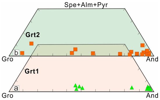 Triangular classification of garnets in the Niukutou deposit (the base diagram is modified from [25]) (a) Grt1–garnets of the first generation with relative enrichment of andradite, represented by green triangles; (b) Grt2–garnets of the second generation with dramatic changes in end-member compositions (andradite and grossular), represented by red squares.