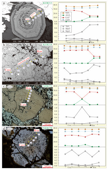 Grt1 had narrow compositional ranges of SiO2 and CaO but wide compositional ranges of FeOT and Al2O3. The contents of MnO and MgO were remarkably low (less than 1%). The end-member composition of Grt1 showed wide changes consisting of And45.08–99.39Gro0.00–51.55 with minor Pys0.61–3.94 (Figure 8a). Well-preserved chemical growth zonations and their analysis results generally showed a decrease in the FeOT or andradite contents and an increase in the Al2O3 or grossular contents from the core to the rim (Figure 9a,b). From the core to the rim, there were slight increases in the MnO content, with negligible changes in TiO2 and MgO (Figure 9a,b).