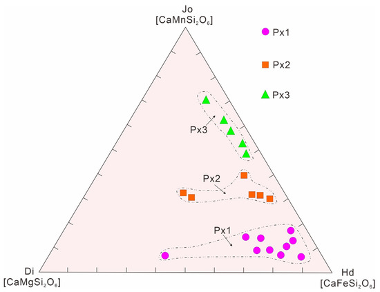 Px3 contained SiO2 (48.32%–49.24%), FeOT (9.28%–15.75%), CaO (18.29%–21.32%), and MnO (12.60%–19.44%). In terms of the components calculated by the johannsenite–hedenbergite–diopside end members [26], Px3 (Di2-4Hd31-53Jo43-65) was composed of johannsenite and hedenbergite, with a small amount of diopside (Figure 10).