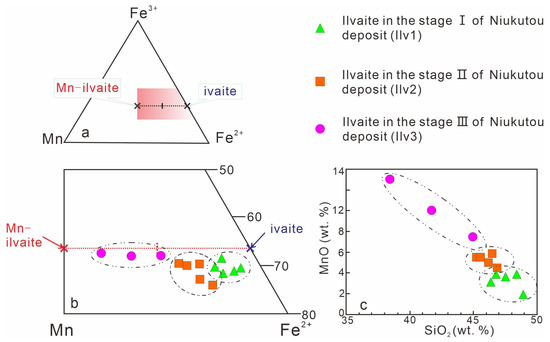 Diagram of Mn–Fe2+–Fe3+ components of three generations of ilvaite (a,b), and SiO2–MnO contents (c) of Niukutou for three generations of ilvaites (modified from [27]).