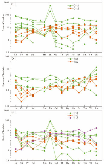 Chondrite-normalized rare earth element (REE) distribution patterns for different generations of garnet (a), pyroxene (b), and ilvaite (c) from the Niukutou deposit. The chondrite-normalized values were calculated in [28].