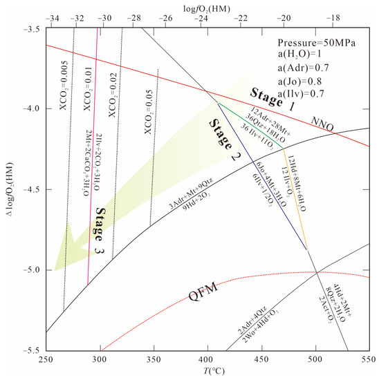 (1) Three mineral assemblages in a prograde metamorphic phase and their corresponding mineralization stages were distinguished in the Niukutou deposit. From Stages 1 to 3, the temperature and fO2 decreased, whereas the pH increased. The ilvaites (Ilv1 to Ilv3) in the retrograde metamorphic phase also indicate lower temperatures, decreased fO2, and lower pH.