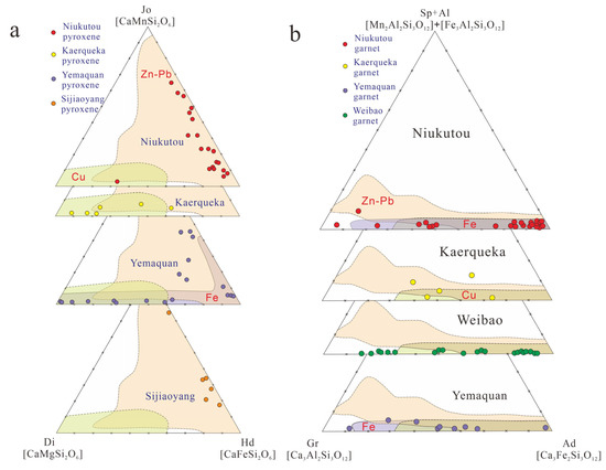 Ternary plots showing the end-member compositions of pyroxenes (a) and garnets (b) from the Niukutou deposit, Qimantagh area (modified after [7]). Data sources: Niukutou, this study; Kaerqueka, Hutouya, and Yemaquan from Feng et al. [21]; Sijiaoyang, [1,50]). Weibao, Kaerqueka, and Hutouya are typical Cu-Pb-Zn skarn deposits in the QMB, whereas Yemaquan and Sijiaoyang are Fe-Cu-Zn and Pb-Zn skarn deposits, respectively. The areas for global Cu, Fe, and Pb-Zn skarn deposits are from Meinert et al. [26]. End members: Jo—johannsenite, Di—diopside, Hd—hedenbergite, Ad—andradite, Gr—grossular, Sp—spessartine, Al—almandine.