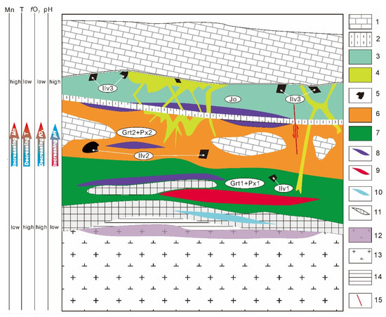 Profile showing the skarn zonation and evolution process of the ore-forming fluid in the Niukutou Pb-Zn skarn deposit: 1—Marble, 2—Siltstone, 3—Ilv3 + Px3 (johannsenite) skarn zoning, 4—epidote + chlorite skarn, 5—Ilvaite, 6—Grt2+Px2 skarn zoning, 7—Grt1+Px1 skarn zoning, 8—Pb-Zn ore body, 9—Fe ore body, 10—Cu ore body, 11—Pyrrhotite (S) ore body, 12—altered granodiorite pluton, 13—Granodiorite pluton, 14—Hornstone belt, and 15—Fault.