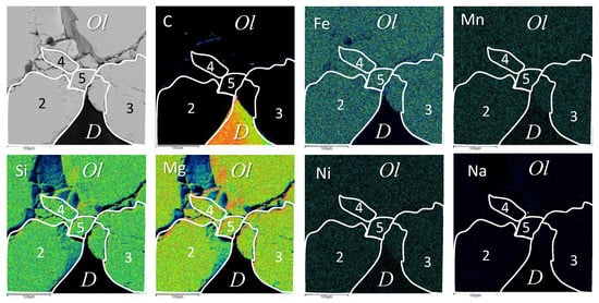 Elemental maps of olivine around diamond. The first left picture shows olivine sections around the diamond analyzed using TESCAN: the numbers 2–5 correspond to numbers (N) in Table 2.