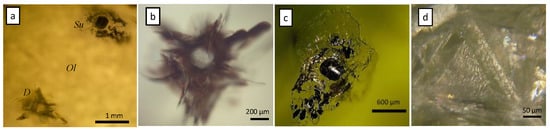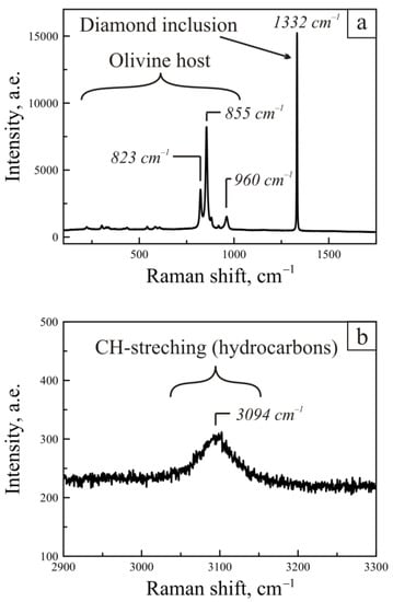 To detect signs of diamond-forming media, the interface between diamond incusion and olivine as well as a net of stress cracks around the diamond were analyzed using the micro-Raman spectroscopic technique. The low-intensity mode in the 3050–3140 cm−1 interval with a peak at 3094 cm−1 was observed in three spectra out of ten. According to [], this value corresponds to the vibrational modes of aromatic or olefinic compounds (Figure 4, Spectrum b). Those spectra were taken from the contact of olivine with diamond directly. Analyses of the cracks far from the diamond showed the forsterite modes only.