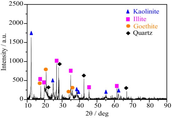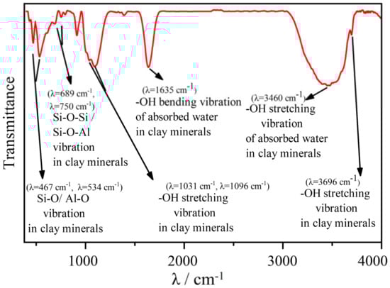 Figure 1 shows the XRD patterns of ionic rare earth ore colloids extracted by the sedimentation method. The results show that the ionic rare earth ore colloid components are dominated by kaolinite and contain small amounts of illite and goethite, and it can be presumed that the IREO colloids surface reactive groups are mainly based on alcoholic hydroxyl groups [,]. In order to exclude the influence of other surface active groups (such as organic acid radical) in the ionic rare earth ore on the acid and alkali properties of the mineral surface, the IREO colloids surface active groups were analyzed by means of infrared spectroscopy. The results are shown in Figure 2, which further confirmed the alcohol hydroxyl group on the surface of IREO colloids is its active group, which is the site of the proton/deprotonation reaction on the mineral surface.