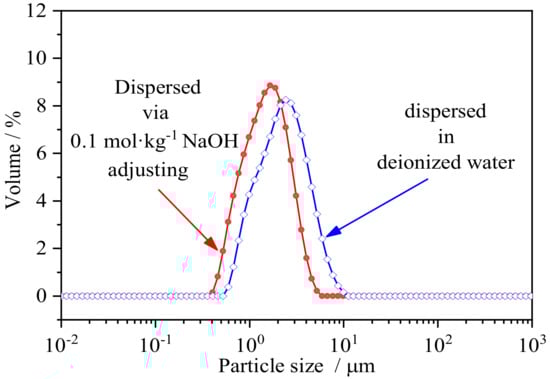 Table 2 shows the results of multiple tests of colloidal particle size in suspensions with no salt addition and after 0.1 mol·kg−1 NaCl disturbed. It can be seen from the results that the IREO colloids Dv50 in 0.1 mol·kg−1 NaCl suspension is approximately 1.93 μm, and that in deionized water suspension is approximately 2.14 μm. The multiple measured value deviation of IREO colloids Dv50 in the two solutions is lower than 0.05 μm, indicating that the aggregation of IREO colloids changes after the electrolyte concentration disturbance, while the particle size measurement results of the aggregates are stable to a certain extent. Therefore, in the subsequent experiments, the aggregation behavior of IREO colloids can be studied and analyzed by means of electrolyte perturbation.