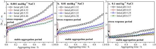 During the stress response period, after salinity and pH value are disturbed, the Dv50 of IREO colloids in the suspension will increase or decrease. Labille et al. found that clay minerals would gather quickly in the initial stage of aggregation or dispersion, and pointed out that the shear force between the mineral surface and the solution medium was the main reason for mineral aggregation in a short time when the light scattering method was utilized to measure the size of clay particles []. In this experiment, IREO colloids Dv50 is greatly affected by the NaCl concentration and pH value of the suspension. It can be preliminarily inferred that the salinity and pH value are the main causes for the rapid aggregation or dispersion of IREO colloids at this stage. In the concentration range from 0.001 mol·kg−1 NaCl to 0.1 mol·kg−1 NaCl, IREO colloids Dv50 generally shows a downward trend with the increase in NaCl concentration during the rapid reaction period, indicating that low concentration electrolyte solution is conducive to the aggregation of IREO colloids. In a 0.001 mol·kg−1 NaCl suspension system, the initial aggregation degree of the mineral colloids is inversely proportional to the pH value of the suspension, indicating that when the electrolyte solution is low, the higher the concentration of H+ in the solution, the better the aggregation of mineral colloids. However, the initial aggregation degree of the mineral colloids at different pH conditions in 0.01 mol·kg−1 NaCl suspension was ranked from largest to smallest as follows: pH 3.52 (Dv50: 2.43μm), pH 5.22 (Dv50: 2.35 μm), pH 6.38 (Dv50: 2.26 μm) and pH 4.41 (Dv50: 2.20 μm); the same order for the 0.1 mol·kg−1 NaCl suspension system is as follows: pH 3.36 (Dv50: 2.00 μm), pH 6.57 (Dv50: 1.94 μm), pH 5.28 (Dv50: 1.92 μm) and pH 4.43 (Dv50: 1.90 μm). This indicates that the increase in salinity will affect the aggregation effect of the suspension’s pH value on IREO colloids.