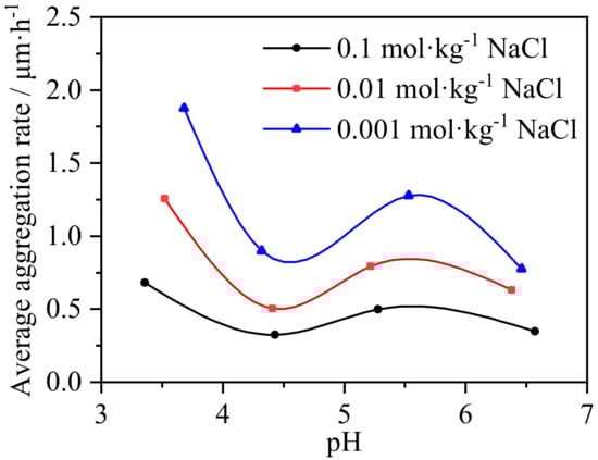 After the stress reaction period, the IREO colloids enter into the stable colloid aggregation period. The particle size of the IREO colloids increases steadily with the increase in aggregation time. This change trend can be fitted by exponential function and a good result can be obtained (Table 3), and the average aggregation rate of the IREO colloids in the stable aggregation period can be calculated (Figure 5), in which the IREO colloids presents a higher aggregation rate at low salinities. This also indicates that colloids are more likely to aggregate in low-salinity solutions. In addition, there is a large correlation between the aggregation rate of colloids and solution pH in Figure 4, which shows a lower aggregation rate at approximately pH 4.5 for all salinity conditions in this experiment. This further suggests that there is an inhibitory effect of approximately pH 4.5 on mineral aggregation.