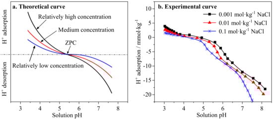 For variable charge clay minerals, H+ and OH− determine ions for their variable charge surface potential, which have a specific pH value. At this pH value, the amount of variable positive charge on the mineral surface is equal to the amount of negative charge on the surface, i.e., the amount of variable net charge on the mineral surface is 0 (ZPC). ZPC is not related to the concentration of solution ions. When the pH of the solution is less than the ZPC, the protonation reaction will occur on the mineral surface to make the mineral surface positively charged. When the pH of the solution is higher than the ZPC, the mineral surface will undergo a depolarization reaction to make the mineral surface negatively charged. The variable charge density of mineral surface can be calculated according to Equation (2) as follows []:
