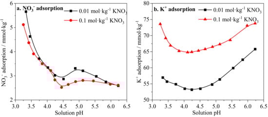 The adsorption curves of K+ and NO3− on IREOs with pH change in two different concentrations of potassium nitrite solutions. (a) NO3− adsorption; (b) K+ adsorption.
