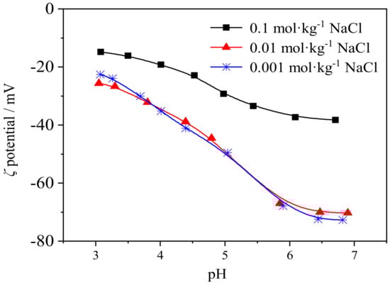 The stability of the mineral colloidal dispersion in solution can be measured by ζ potential. The higher the absolute value of ζ potential, the stronger the dispersion stability of the colloidal system. Otherwise, aggregation occurs easily. Figure 8 presents the curves of ζ potential on the surface of IREO colloids in suspension with different NaCl concentrations, which changes with pH value. The ζ potential of all curves in the figure is negative, indicating that the net surface charges of IREO colloids are all negative under the experimental conditions. As the pH value of suspension decreases, the amount of variable positive charge on mineral surface increases, and the ζ potential of all curves in Figure 8 moves forward accordingly. Theoretically, when the concentration of ions in solution is increased, the absolute value of ζ potential on mineral surface will be reduced by double layer compression. In Figure 8, the ζ–pH curves of the two suspension systems (0.001 mol·kg−1 NaCl and 0.01 mol·kg−1 NaCl), are mostly coincident. Moreover, when pH < 4, the absolute value of the ζ potential of the IREO colloids in 0.001 mol·kg−1 NaCl suspension is even slightly lower than that of 0.01 mol·kg−1 NaCl system. It may be related to the stronger interaction between the double electric layers on the IREO colloids surface under the condition of low ion concentration. This is consistent with the research results of Li et al. []; the interaction between positive and negative charge electric double layers under low concentration conditions will promote the ζ potential on the surface of clay minerals to move forward. Therefore, the influence of pH and NaCl concentration on the surface charge properties of IREO colloids is not only related to the proton/deprotonation behavior of the mineral surface by electrolyte concentration and pH value, but also needs to consider the interaction between the positive and negative charge surface electric double layers of the mineral.