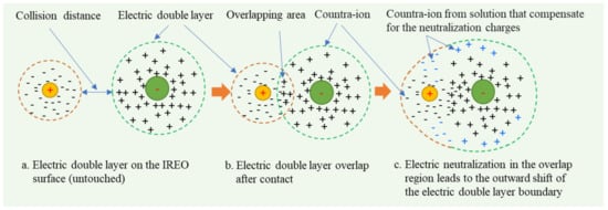 The overlapping of the double electric layer on the IREO colloidal surfaces during agglomeration.
