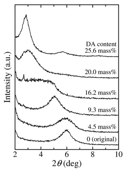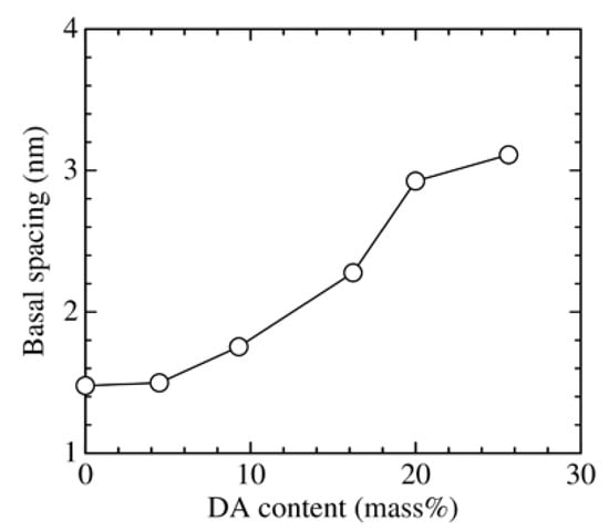 The X-ray diffraction (XRD) pattern and basal spacing of the organoclay samples are shown in Figure 1 and Figure 2, respectively, together with those of the original clay. The original Japanese acid clay (DA0) had a diffraction peak at 2θ ≈ 6°, which almost coincided with acidic (protonated) montmorillonite [] with a basal spacing of 1.5 nm. When the DA content was 4.5 mass% (i.e., DA1 sample), the crystal structure was almost the same as that of the original, which suggested that the DA molecules adhered onto the exterior surface of clay particles without intercalation into the montmorillonite interlayer spaces. As the DA content was increased, the basal spacing increased due to the intercalation of DA molecules. The DA2 sample (9.3 mass%) had a basal spacing of 1.8 nm, which was similar to the diameter (approximately 0.3 nm) of the DA molecule, which was estimated assuming that the shape of the DA molecule was cylindrical. This suggests that the DA2 sample has a lateral monolayer-type structure [,]. The DA3 sample (16.2 mass%) had a broad peak, indicating a disordered structure due to the transition region. In contrast, the diffraction peaks of the DA4 and DA5 samples (20.0 and 25.6 mass%, respectively) were sharp. In particular, the DA5 sample had a well-ordered intercalation structure with a basal spacing of 3.1 nm, suggesting a paraffin-type bilayer structure [,].