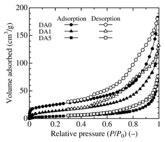 Nitrogen adsorption–desorption isotherms of the DA0, DA1, and DA5 samples.