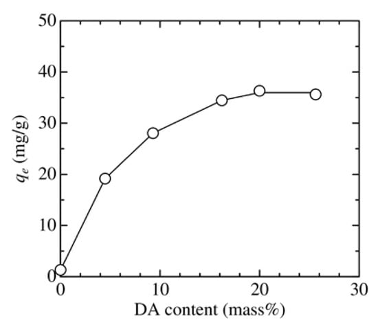 The change in the MO equilibrium adsorption capacity with the DA content of the organoclay samples is illustrated in Figure 6. The equilibrium adsorption capacity drastically increased with increasing DA content below 9.3 mass%, which indicates that the DA molecules in the organoclays act as the adsorption sites for MO. The adsorption capacity reached 36 mg/g at a DA content above 20 mass% (i.e., the DA4 and DA5 samples). However, at higher than 9.3 mass% the increase in the adsorption capacity was slight, which suggested that the rate of effective adsorption sites decreased at high DA contents.
