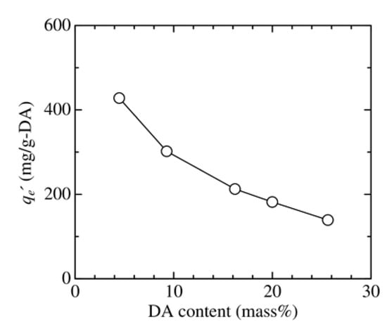 The relationship between the equilibrium adsorption capacity and the basal spacing of the samples is shown in Figure 7. Although the DA1 sample (4.5 mass% DA) had almost the same basal spacing as DA0 (original clay), the DA1 sample had a much larger adsorption capacity than DA0 due to surface modification with DA. The DA-intercalated samples with large values of basal spacing possessed relatively large amounts of DA molecules in the interlayer spaces, which resulted in high adsorption capacities. To investigate the effectiveness of DA in MO adsorption, the equilibrium adsorption capacity qe’ [mg/g-DA] per unit mass of DA was calculated for each organoclay sample. As shown in Figure 8, qe’ monotonically decreased with increasing DA content, which suggests that DA molecules on the exterior surface of clay particles acted as relatively more effective adsorption sites than in the interlayer spaces.