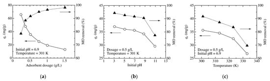 The effects of adsorbent dosage, initial pH value, and temperature on the MO equilibrium adsorption capacity and removal efficiency of the DA5 sample, which had the maximal adsorption capacity among the samples, are displayed in Figure 9. With increasing adsorbent dosage, the removal efficiency gradually increased and reached 98% at 1.5 g/L due to an increase in the total surface area of the adsorbent (Figure 9a). However, the equilibrium adsorption capacity decreased as the adsorbent dosage was increased, which suggested a decrease in the rate of effective adsorption sites in the adsorbent.