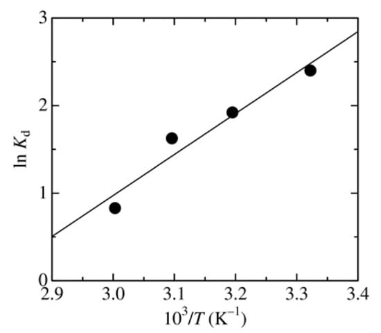 Plot of ln Kd against 1/T for estimation of thermodynamic parameters for adsorption of MO onto the DA5 sample (dosage = 0.5 g/L, initial concentration = 20 mg/L, initial pH = 6.9).