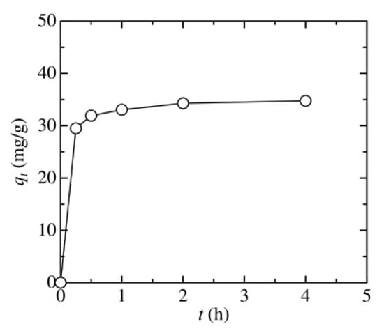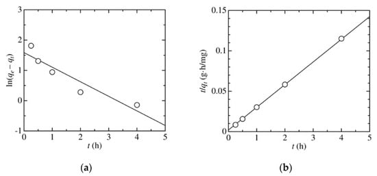 The change in the adsorbed amount of MO with the contact time is illustrated in Figure 11. The adsorbed amount of MO rapidly increased in the initial stage and approximately reached equilibrium after several hours. To investigate the mechanism of adsorption, two kinetic models (pseudo-first-order and pseudo-second-order equation models), which are expressed by Equations (5) and (6), respectively, were applied to the experimental data.