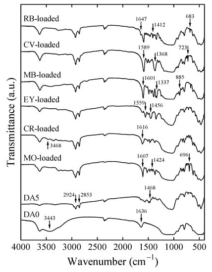 FT-IR spectra of DA0 (original acid clay) and DA5 samples after adsorption of MO, CR, EY, MB, CV and RB (dosage = 0.5 g/L, initial concentration = 100 mg/L, temperature = 301 K).