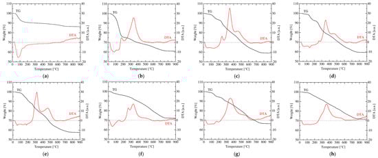 TG-DTA curves of (a) DA0 and DA5 samples (b) before adsorption and after adsorption of (c) MO, (d) CR, (e) EY, (f) MB, (g) CV and (h) RB (dosage = 0.5 g/L, initial concentration = 100 mg/L, temperature = 301 K).