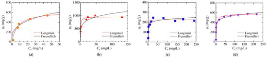 where qL (mg/g) is the maximum adsorption capacity of the adsorbent, KL (L/mg) is the Langmuir constant, and KF (L/mg) and n (–) are the Freundlich constants. As shown in Figure 16 and Table 5, the Langmuir equation fit the experimental adsorption data well, thereby representing monolayer adsorption on a homogeneous surface.