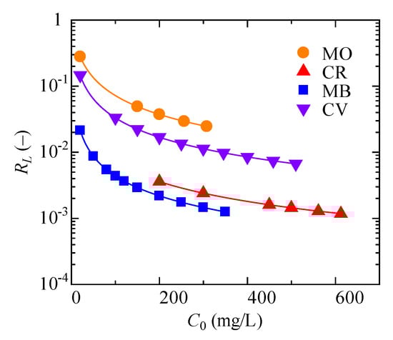 where C0 is the initial dye concentration. As shown in Figure 17, the RL values for the MO, CR, MB and CV adsorption onto the DA5 sample were between 0.001 and 0.3, which were in the range of 0 < RL < 1; hence, the DA5 sample shows satisfactory adsorption of the dyes under the specified conditions []. In particular, RL for the CR, MB, and CV adsorption was below 0.01 in many experiments, suggesting that the DA5 sample undergoes an irreversible dye adsorption process over a wide range of initial dye concentrations.