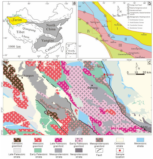 (a) Tectonic subdivision of China showing the location of the Tarim block, North Tarim Terrane, and South Tarim Terrane modified from [34]; (b) Tectonic subdivision of west Kunlun orogenic belt (modified from [36]); (c) Simplified geologic map of the central-west part of the West Kunlun orogenic belt (after [37]), showing the location of the Qiate section.