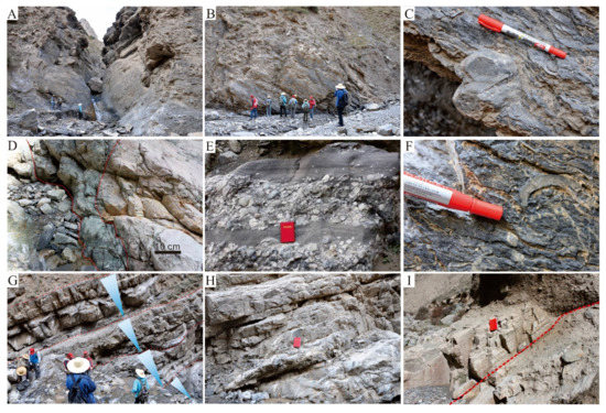 The Qiate Formation (Figure 3D–I and Figure 4D–I) is mainly composed of a conglomerate in the lower part with interbedded fine-grained quartz sandstone, the grain size decreases upward. The depositional environment of the Qiate Formation was shoreface. Clasts in the conglomerate are well-rounded but poorly sorted, mostly grain-supported. The gravel ranges from 1~10 cm in size, and the components of which are dominated by quartzite, chert, and vein quartz. Horizontal bedding, rhythmic bedding, and wedge-shaped cross stratification have been identified, suggesting a shoreface environment.
