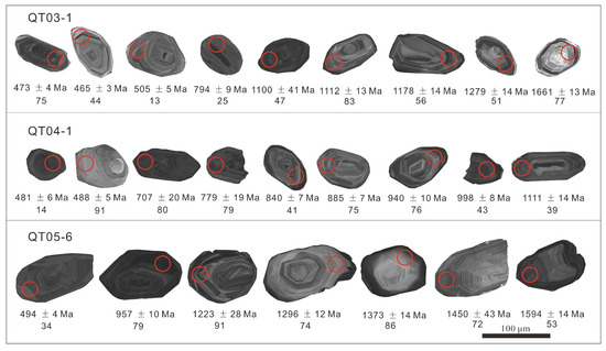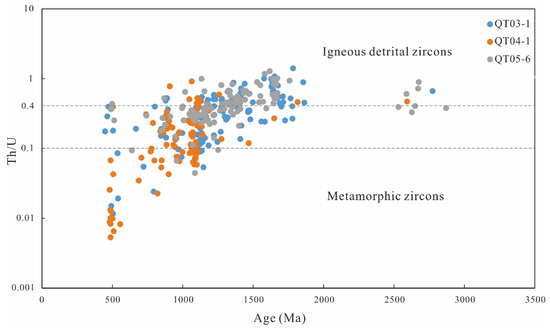 Three Ordovician samples of the Qiate Section were collected for zircon U-Pb dating (Figure 1c and Figure 2), and a total of 316 detrital zircon grains were analyzed. Representative cathodoluminescence (CL) images of zircons and corresponding 207Pb/206Pb ages (>1000 Ma), 206Pb/238 U ages (<1000 Ma) shown in Figure 5. Zircons from QT05-6 are coarser (>100 μm in length) than those from QT03-1 and QT04-1 (<100 μm in length). Most of the zircons have width/length ratios of 1:1.5–1:2 and are rounded to subrounded in shape. Narrow oscillatory zone is visible under CL, some grains show bright or dark overgrowth rims or core-rim structures that indicated a later metamorphic overprint, and some grains exhibit homogenous internal structures. The Th/U ratio is regarded as an indicator to distinguish magmatic zircons (>0.4) from metamorphic zircons (<0.1) [67]. About 46% of these zircons exhibited high Th/U (>0.4), which represented igneous detrital zircons, and about 17% of them exhibited low Th/U (<0.1), which represented metamorphic zircons (Figure 6). There are more metamorphic zircons in grains with younger age. This implies the source of detritus from metamorphic rocks.