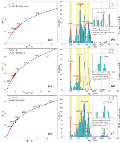 Detrital zircons U-Pb data from sedimentary rocks can be used to constrain the maximum depositional age (e.g., [25,26]), provenance and the affinities of terranes [12,27,28,29]. Certain age components may be particularly significant as an indicator of a specific provenance [30]. In this study, we carried out U-Pb isotopic analysis on detrital zircons from the Ordovician Malieziken Group, collected from the Qiate section, southwestern Tarim, in combination with previously published data, to reveal the possible position of Tarim. Our conclusion shows that the Tarim is close to Western Australia, Lhasa, and East Sumatra in northeastern Gondwana during the Ordovician.