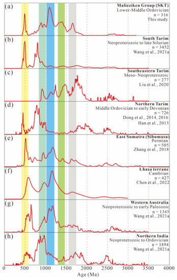 Relative probability diagrams showing the U-Pb age distributions of (a) the Malieziken Group (this study), (b) South Tarim [12], (c) Southeastern Tarim [10], (d) Northern Tarim [28,70,71] and other relevant Rodinia continental blocks, such as (e) Sibumasu [72], (f) Lhasa terrane [73], (g) Western Australia [12], (h) Northern India [12].