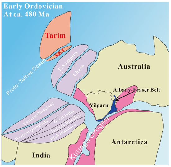 The configuration of the major crustal blocks (e.g., India, Australia, East Antarctica, and Africa) that constitute the core of the Gondwana have been well constrained [1,2,3]. During the Ordovician, Asian blocks (such as South China, North China, Tarim, Lhasa, and Sibumasu) were located in the northeastern peri-Gondwana region [4,5,6,7]. However, the exact positions of Tarim in northeastern Gondwana are still controversial. The position of the Tarim in Gondwana is crucial for understanding its evolution.